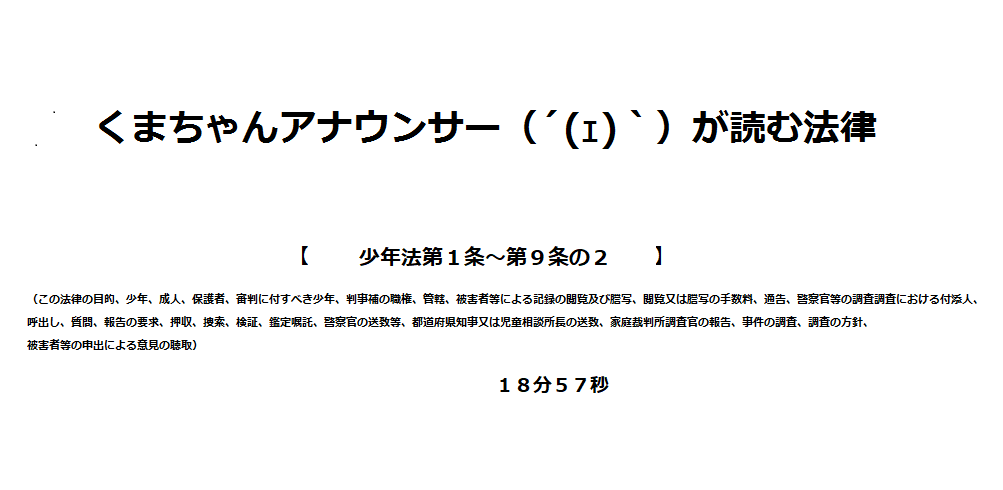 (この法律の目的、少年、成人、保護者、審判に付すべき少年、判事補の職権、管轄、被害者等による記録の閲覧及び謄写、閲覧又は謄写の手数料、通告、警察官等の調査調査における付添人、呼出し、質問、報告の要求、押収、捜索、検証、鑑定嘱託、警察官の送致等、都道府県知事又は児童相談所長の送致、家庭裁判所調査官の報告、事件の調査、調査の方針、被害者等の申出による意見の聴取)のナレーションです。